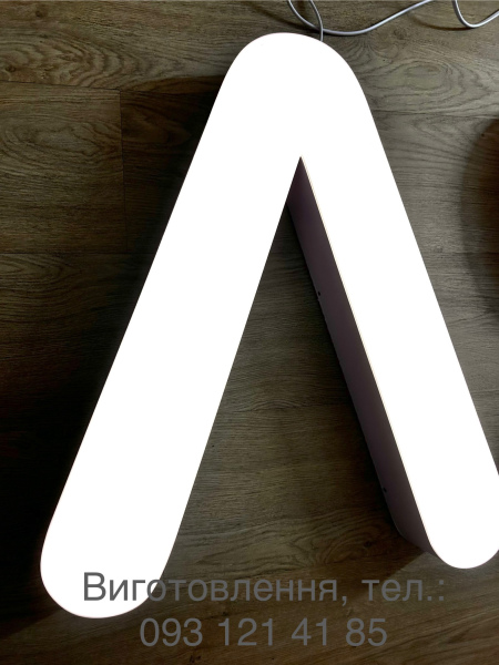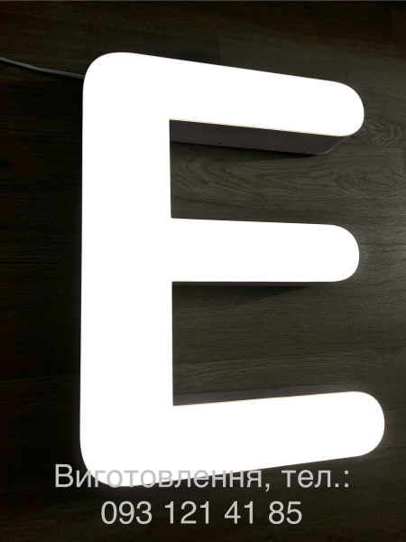 Розглянемо поетапно. Передня частина, лицьова частина літери фрезерована на органічному склі (акрилі) молочного кольору, світлопроникність акрилу спеціально підібрана для світлодіодного підсвічування на основі SMD технологій. Боковини літери виготовлені з полістиролу і вигнуті за формою шляхом термічної обробки. Для склеювання букви використовуємо всесезонний клей (СА 12) із застосуванням зачистки склеюваних поверхонь і знежиренням спеціальною рідиною для акрилових поверхонь. Задня частина букв фрезерується на пластику ПВХ, після фрезерування на задню частину букви наноситься борт з додатковим нанесенням силікону.