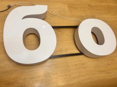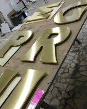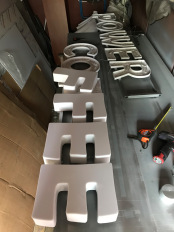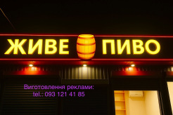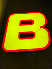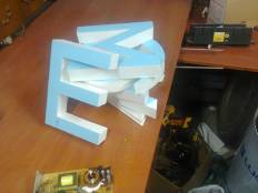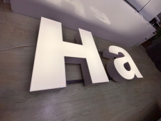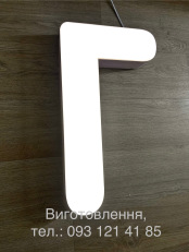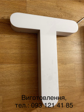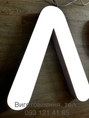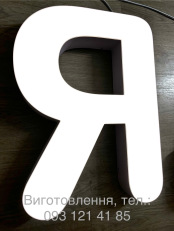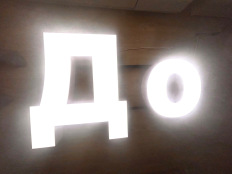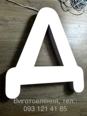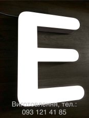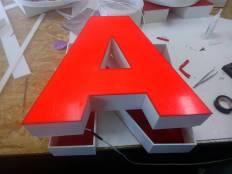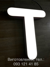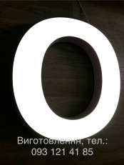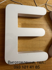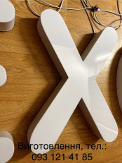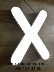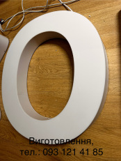 Розглянемо поетапно. Передня частина, лицьова частина літери фрезерована на органічному склі (акрилі) молочного кольору, світлопроникність акрилу спеціально підібрана для світлодіодного підсвічування на основі SMD технологій. Боковини літери виготовлені з полістиролу і вигнуті за формою шляхом термічної обробки. Для склеювання букви використовуємо всесезонний клей (СА 12) із застосуванням зачистки склеюваних поверхонь і знежиренням спеціальною рідиною для акрилових поверхонь. Задня частина букв фрезерується на пластику ПВХ, після фрезерування на задню частину букви наноситься борт з додатковим нанесенням силікону.